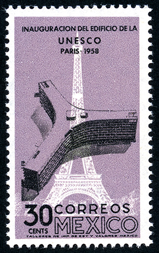 Edificio de la UNESCO en París y Torre Eíffel -- Con marca de Agua: MEX-MEX Y ÁGUILA EN CÍRCULO ABIERTO EN POSICIÓN VERTICAL ( XVI ) -- Fotograbado -- Con Perforación -- Treinta Centavos -- Lila y Negro