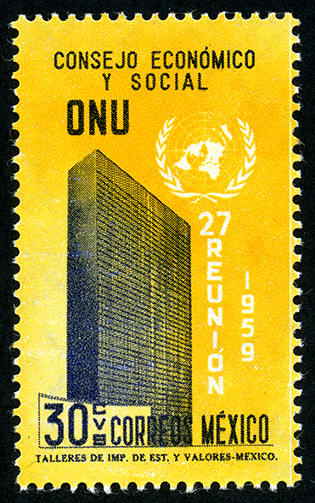 Sede General de la ONU, Nueva York, EUA -- Con marca de Agua: MEX-MEX Y ÁGUILA EN CÍRCULO ABIERTO EN POSICIÓN VERTICAL ( XVI ) -- Litografiado -- Con Perforación -- Treinta Centavos -- Amarillo y Azul Oscuro