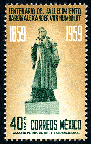 Bicentenario de la muerte del Naturista y Geógrafo Alexander Von Humboldt -- Con marca de Agua: MEX-MEX Y ÁGUILA EN CÍRCULO ABIERTO EN POSICIÓN VERTICAL ( XVI ) -- Fotograbado -- Con Perforación -- Cuarenta Centavos -- Café Amarillento y Verde Oscuro