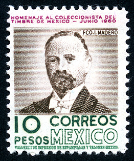 Homenaje al Coleccionista del Timbre de México -- Con marca de Agua: MEX-MEX Y ÁGUILA EN CÍRCULO ABIERTO EN POSICIÓN VERTICAL ( XVI ) -- Grabado -- Con Perforación -- Diez Pesos -- Lila Café Verde Rojo