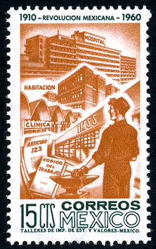 No. Scott: 914 -- Año de Emisión: 1960-1961 -- Valor facial: Quince Centavos -- Variedad de color: Verde y Café Sepia -- Perforación: 14 -- Tipo de impresión: GrabadoTimbre Postal Mexicano en colores verde y café sepia, en la imagen se observan diversos edificios con los nombres de: HOSPITAL, HABITACIÓN CLÍNICA, IMSS, tres hojas sueltas con el título de ARTÍCULO 123 y un libro titulado CÓDIGO DEL TRABAJO" así como una persona verstida de obrero, en la parte superior aparece escrito "REVOLUCIÓN MEXICANA 1910-1960" y en la parte inferior el valor facial de "15 CTS" y "CORREOS MEXICO".