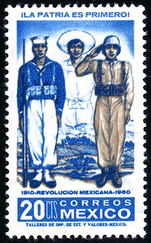 Soldado, Marino y Campesino -- Con marca de Agua: MEX-MEX Y ÁGUILA EN CÍRCULO ABIERTO EN POSICIÓN HORIZONTAL Y VERTICAL ( XVI ) -- Fotograbado -- Con Perforación -- Veinte Centavos -- Azul Café