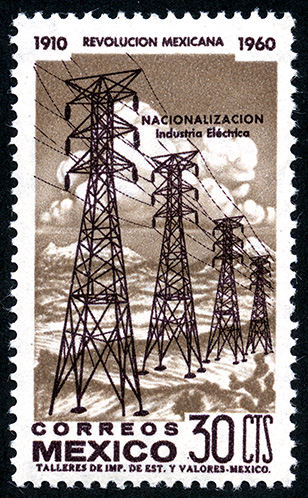 No. Scott: 916 -- Año de Emisión: 1960-1961 -- Valor facial: Treinta Centavos -- Variedad de color: Violeta y Café Rojizo -- Perforación: 14 -- Tipo de impresión: Grabado Timbre Postal Mexicano en colores violeta y café rojizo, al fondo de la imagen se observan montañas y un cielo con nubes, al frente hay cuatro torres de alta tensión, en la parte superior de la imagen aparece escrito "1910-REVOLUCION MEXICANA-1960" y en la parte inferior "CORREOS MEXICO" y el valor facial de "30 CTS". Para más información favor de dirigirse a biblioteca@mufi.org.mx