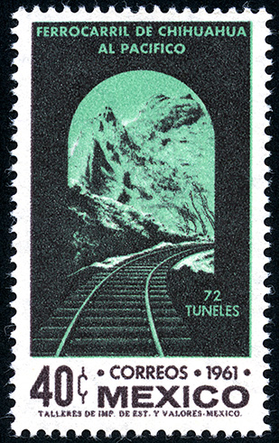 Tunel de Ferrocarril Barranca del Cobre Chihuahua -- Con marca de Agua: MEX-MEX Y ÁGUILA EN CÍRCULO ABIERTO EN POSICIÓN HORIZONTAL ( XVI ) -- Fotograbado -- Con Perforación -- Cuarenta Centavos -- Verde Negro