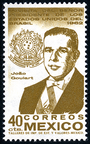Joao Goulart Presidente de Brasil -- Con marca de Agua: MEX-MEX Y ÁGUILA EN CÍRCULO ABIERTO EN POSICIÓN HORIZONTAL ( XVI ) -- Fotograbado -- Con Perforación -- Cuarenta Centavos -- Café Olivo