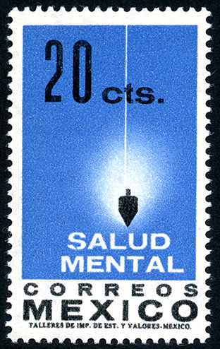 No. Scott: 924 -- Año de Emisión:1962 -- Valor facial: Veinte Centavos -- Variedad de color: Azul Negro -- Perforación: 14 -- Tipo de impresión: Grabado Timbre Postal Mexicano en colores azul y negro, en la imagen hay un péndulo colgado y atrás un color blanco brilloso, en la parte superior está escrito "20 CTS" y en la parte inferior "SALUD MENTAL" y "CORREOS MEXICO". Para más información favor de dirigirse a biblioteca@mufi.org.mx