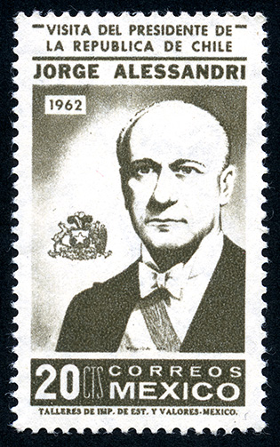 Jorge Alessandri Presidente de Chile -- Con marca de Agua: MEX-MEX Y ÁGUILA EN CÍRCULO ABIERTO EN POSICIÓN VERTICAL ( XVI ) -- Fotograbado -- Con Perforación -- Veinte Centavos -- Verde Olivo Oscuro