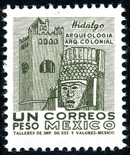 Convento de Actopan y Cabeza de Atlante Estado de Hidalgo. -- Con marca de Agua: MEX-MEX Y ÁGUILA EN CÍRCULO ABIERTO EN POSICIÓN VERTICAL ( XVI ) -- Grabado -- Con Perforación -- Un Peso -- Café Olivo