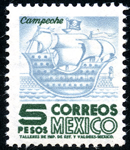 Galeón Pirata del Siglo XVI, Estado de Campeche. -- Con marca de Agua: MEX-MEX Y ÁGUILA EN CÍRCULO ABIERTO EN POSICIÓN HORIZONTAL ( XVI ) -- Grabado -- Con Perforación -- Cinco Pesos -- Ultramarino y Verde Azulado