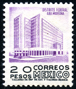 No. Scott: 931 -- Año de Emisión: 1962-1974 -- Valor facial: Veinte Pesos -- Variedad de color: Violeta y Negro -- Perforación: 14 -- Tipo de impresión: Grabado Timbre Postal Mexicano en colores violeta y negro, en la imagen se observa un edificio moderno, el cual se ubica en el Estado de México, D.F., en la parte inferior aparece escrito "CORREOS MEXICO" y el valor facial de "20 PESOS". Para más información favor de dirigirse a biblioteca@mufi.org.mx