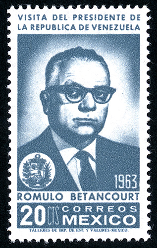 No. Scott: 932 -- Año de Emisión: 1963 -- Valor facial: Veinte Pesos -- Variedad de color: Gris Pizarra -- Perforación: 14 -- Tipo de impresión: Grabado Timbre Postal Mexicano en color gris pizarra, en la imagen se observa la efigie de Rómulo Betancourt, Presidente de Venezuela, en la parte superior aparece escrito "VISITA DEL PRESIDENTE DE LA REPÚBLICA DE VENEZUELA" y en la parte inferior "ROMULO BETANCOURT", el valor facial de "20 CTS" y "CORREOS MEXICO". Para más información favor de dirigirse a biblioteca@mufi.org.mx