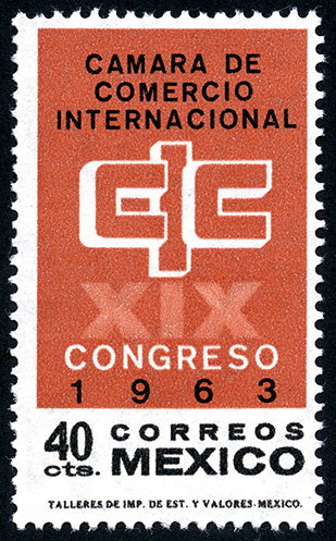 No. Scott: 933 -- Año de Emisión: 1963 -- Valor facial: Cuarenta Centavos -- Variedad de color: Naranja y Negro -- Perforación: 14 -- Tipo de impresión: Grabado Timbre Postal Mexicano en colores naranja y negro, en la imagen aparecen las siglas de la "CAMARA DE COMERCIO INTERNACIONAL CIC" XIX CONGRESO 1963" y en la parte inferior está escrito el valor facial de "40 CENTAVOS" y "CORREOS MEXICO". Para más información favor de dirigirse a biblioteca@mufi.org.mx