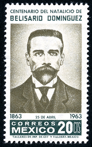 Belisario Domínguez. -- Con marca de Agua: MEX-MEX Y ÁGUILA EN CÍRCULO ABIERTO EN POSICIÓN HORIZONTAL ( XVI ) -- Fotograbado -- Con Perforación -- Veinte Centavos -- Verde Oscuro Gris Olivo