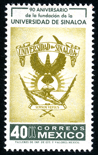 No. Scott: 941 -- Año de Emisión: 1963 -- Valor facial: Cuarenta Centavos -- Variedad de color: Verde y Café Olivo -- Perforación: 14 -- Tipo de impresión: Grabado Timbre Postal Mexicano en colores verde y café olivo, en la imagen aparece el Escudo de la Universidad de Sinaloa, en la parte superior aparece escrito "90 ANIVERSARIO DE LA FUNDACION DE LA UNIVERSIDAD DE SINALOA" y en la parte inferior el valor facial de "40 CTS" y "CORREOS MEXICO". Para más información favor de dirigirse a biblioteca@mufi.org.mx