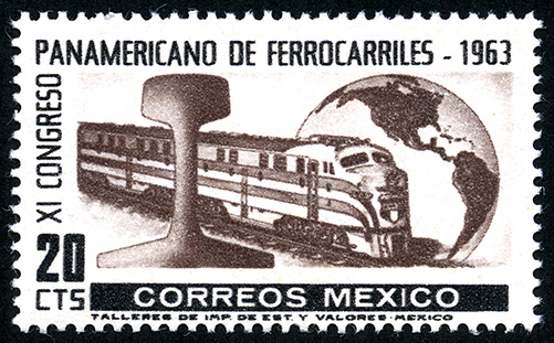 No. Scott: 942 -- Año de Emisión: 1963 -- Valor facial: Veinte Centavos -- Variedad de color: Negro y Café Oscuro -- Perforación: 14 -- Tipo de impresión: Grabado Timbre Postal Mexicano en colores negro y café oscuro, en la imagen se observa un trén sobre vías, perfíl de riel y un globo terráqueo, en el contorno izquierdo y parte superior aparece escrito "XI CONGRESO PANAMERICANO DE FERROCARRILES 1963", y en la parte inferiror el valor facial de "20 CTS" y "CORREOS MEXICO". Para más información favor de dirigirse a biblioteca@mufi.org.mx