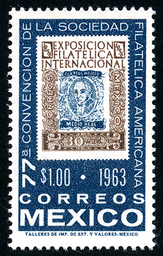 No. Scott: 937 -- Año de Emisión: 1963 -- Valor facial: Veinte Centavos -- Variedad de color: Azul y Café -- Perforación: 14 -- Tipo de impresión: Grabado Timbre Postal Mexicano en colores azul y cafe, en la imagen se observa la primera estampilla de México, en el contorno izquierdo y parte superior aparece escrirto "77a CONVENCION DE LA SOCIEDAD FILATELICA MEXICANA 1963", en la parte inferior el valor facial de "UN PESO" y "CORREOS MEXICO". Para más información favor de dirigirse a biblioteca@mufi.org.mx