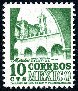 No. Scott: 944 -- Año de Emisión: 1963-1966 -- Valor facial: Diez Centavos -- Variedad de color: Verde Oscuro -- Perforación: 14 -- Tipo de impresión: Grabado Timbre Postal Mexicano en color verde oscuro, en la imagen se observa el Convento Dominico, La Natividad, edificio histórico perteneciente al Estado de Morelos, en la parte inferior está escrito "CORREOS MEXICO" y el valor facial de "10 CTS". Para más información favor de dirigirse a biblioteca@mufi.org.mx