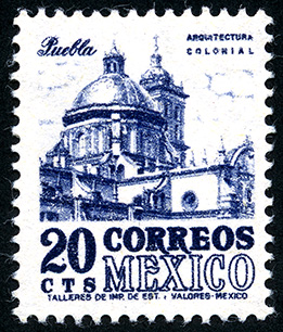 No. Scott: 946 -- Año de Emisión: 1963-1966 -- Valor facial: Veinte Centavos -- Variedad de color: Azul -- Perforación: 14 -- Tipo de impresión: Grabado Timbre Postal Mexicano en color azul, en la imagen se observa la Catedral de la Ciudad de Puebla,en la parte superior aparece escrito "ARQUITECTURA COLONIAL" , en la parte inferior "CORREOS MEXICO" y el valor facial de "20 CTS". Para más información favor de dirigirse a biblioteca@mufi.org.mx