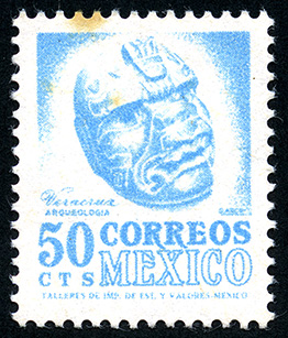 Cabeza Olmeca Tres Zapotes Estado de Veracruz. -- Con marca de Agua: MEX GRANDE Y ÁGUILA EN CÍRCULO (XVIII) -- Fotograbado -- Con Perforación -- Cincuenta Centavos -- Azul