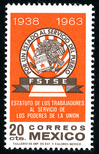 Emblema de la FSTSE por un Estado al Servicio del Pueblo. -- Con marca de Agua: MEX GRANDE Y ÁGUILA EN CÍRCULO (XVIII) -- Grabado -- Con Perforación -- Veinte Centavos -- Bermellón y Café
