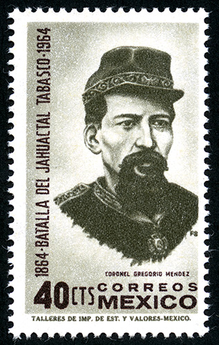 No. Scott: 959 -- Año de Emisión: 1964 -- Valor facial: Cuarenta Centavos -- Variedad de color: Gris y Café -- Perforación: 14 -- Tipo de impresión: Grabado Timbre Postal Mexicano en colores gris y café, en la imagen se observa la efigie del Coronel Gregorio Méndez, en el costado lateral izquierdo está escrito "1864-BATALLA DEL JAHUACTAC TABASCO-1964" y en la parte inferior el valor facial de "40 CTS" y "CORREOS MEXICO". Para más información favor de dirigirse a biblioteca@mufi.org.mx
