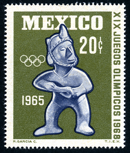 No. Scott: 965 -- Año de Emisión: 1965 -- Valor facial: Veinte Centavos -- Variedad de color: Verde Olivo, Azul Violeta -- Perforación: 14 -- Tipo de impresión: Grabado Timbre Postal Mexicano en colores verde olivo y azul violeta, en la imagen se observa una figura arqueológica de arcilla, sobre la imagen está escrito "MEXICO", el valor facial de "20 CTS", "1965" y en el contorno del lado derecho "XIX JUEGOS OLÍMPICOS 1968". Para más información favor de dirigirse a biblioteca@mufi.org.mx