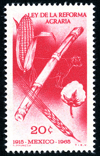 No. Scott: 968 -- Año de Emisión: 1966 -- Valor facial: Veinte Centavos -- Variedad de color: Rojo -- Perforación: 14 -- Tipo de impresión: Grabado Timbre Postal Mexicano en color rojo, en la imagen se observa productos agrícolas y ganaderos como un toro, elote, caña, algodón y trigo, en la parte superior esta escrito "LEY DE LA REFORMA AGRARIA", en la parte inferior el valor facial de "20 CTS" y "1915 MEXICO 1965". Para más información favor de dirigirse a biblioteca@mufi.org.mx