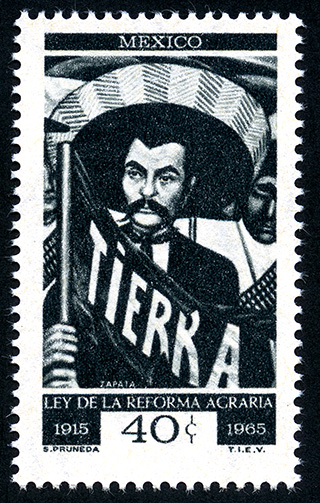 No. Scott: 969 -- Año de Emisión: 1966 -- Valor facial: Cuarenta Centavos -- Variedad de color: Negro -- Perforación: 14 -- Tipo de impresión: Grabado Timbre Postal Mexicano en color negro, en la imagen se observa en primer plano a Emiliano Zapata sosteniendo una bandera que dice "TIERRA", al fondo está otro personaje de la revolución, en la parte superior esta escrito "MEXICO", en la parte inferior "LEY DE LA REFPORMA AGRARIA 1915-1965" y el valor facial de "40 CTS". Para más información favor de dirigirse a biblioteca@mufi.org.mx