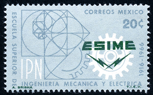 No. Scott: 972 -- Año de Emisión: 1966 -- Valor facial: Veinte Centavos -- Variedad de color: Gris y Verde -- Perforación: 14 -- Tipo de impresión: Grabado Timbre Postal Mexicano en color gris y verde, en la imagen se observa gran variedad de figuras geométricas y las siglas IPN y ESIME, en la parte superior lado derecho está escrito "CORREOS MEXICO" y el valor facial de "20 CTS", en el contorno izquierdo "ESCUELA SUPERIOR DE INGENIERÍA MECÁNICA Y ELÉCTRICA . Para más información favor de dirigirse a biblioteca@mufi.org.mx