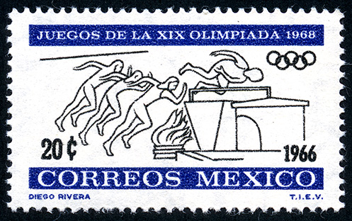 No. Scott: 974 -- Año de Emisión: 1966 -- Valor facial: Veinte Centavos -- Variedad de color: Azul Oscuro y Negro -- Perforación: 14 -- Tipo de impresión: Grabado Timbre Postal Mexicano en colores azul oscuro y negro, en la imagen se observan cuatro figuras humanas, en mi opinión van corriendo y saltando obstáculos, en la parte superior está escrito "JUEGOS DE LA XIX OLIMPIADA 1968", en la parte inferior el valor facial de "20 CTS", "1966" Y "CORREOS MEXICO". Para más información favor de dirigirse a biblioteca@mufi.org.mx