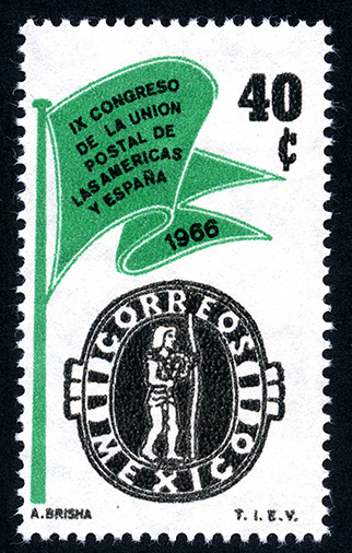 Emblema y Estandarte del Correo de México -- Con marca de Agua: MEX MEX Y ÁGUILA EN CÍRCULO ABIERTO ( XVI ) -- Huecograbado -- Con Perforación -- Cuarenta Centavos -- Verde Esmeralda, Negro