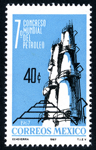 No. Scott: 977 -- Año de Emisión: 1967 -- Valor facial: Cuarenta Centavos -- Variedad de color: Azul y Negro -- Perforación: 14 -- Tipo de impresión: Grabado Timbre Postal Mexicano en colores azul y negro, en la imagen se observan una refinería petrolera y una pirámide, en la parte superior está escrito "7o. CONGRESO MUNDIAL DEL PETROLEO", en el centro, el valor facial de "40 CTS" y en la parte inferior "CORREOS MEXICO". Para más información favor de dirigirse a biblioteca@mufi.org.mx