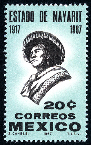 No. Scott: 978 -- Año de Emisión: 1967 -- Valor facial: Veinte Centavos -- Variedad de color: Verde y Negro -- Perforación: 14 -- Tipo de impresión: Grabado Timbre Postal Mexicano en colores verde y negro, en la imagen se observa el busto de un indígena quien lleva una capa sobre los hombros y en la cabeza un sombrero posiblemente de palma con colgados alrededor, en la parte superior está escrito "ESTADO DE NAYARIT 1917-1967", en el inferior el valor facial de "20 CTS" y "CORREOS MEXICO". Para más información favor de dirigirse a biblioteca@mufi.org.mx
