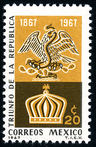 No. Scott: 980 -- Año de Emisión: 1967 -- Valor facial: Veinte Centavos -- Variedad de color: Ocre y Negro -- Perforación: 14 -- Tipo de impresión: Grabado Timbre Postal Mexicano en colores ocre y negro, en la imagen se observan una corona y un aguila con una serpiente en el pico, en la parte superior está escrito el periodo "1867-1967", en el contorno de lado izquierdo "TRIUNFO DE LA REPUBLICA" , en la parte inferior el valor facial de "20 CTS" y "CORREOS MEXICO". Para más información favor de dirigirse a biblioteca@mufi.org.mx