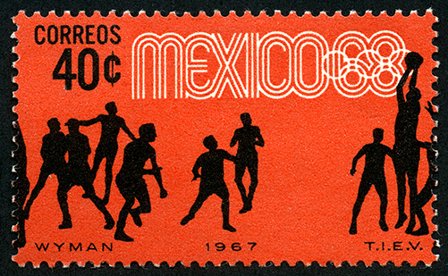 No. Scott: 982 -- Año de Emisión: 1967 -- Valor facial: Cuarenta Centavos -- Variedad de color: Rojo y Negro -- Perforación: 14 -- Tipo de impresión: Grabado Timbre Postal Mexicano en colores rojo y negro, en la imagen se observan figuras humanas realizando actividades de baloncesto, en la parte superior aparece escrito el valor facial de "40 CTS" y "MEXICO 68". Para más información favor de dirigirse a biblioteca@mufi.org.mx