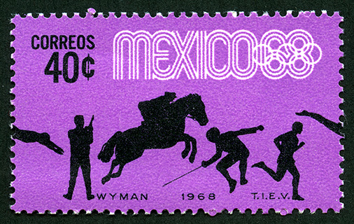 No. Scott: 991 -- Año de Emisión: 1968 -- Valor facial: Cuarenta Centavos -- Variedad de color: Violeta y Negro -- Perforación: 14 -- Tipo de impresión: Grabado Timbre Postal Mexicano en colores violeta y negro, en la imagen se observan figuras humanas realizando diversas actividades deportivas, en la parte superior aparece escrito el valor facial de "40 CTS" y "MEXICO 68". Para más información favor de dirigirse a biblioteca@mufi.org.mx