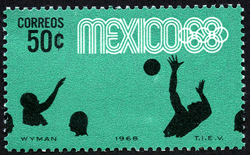 No. Scott: 992 -- Año de Emisión: 1968 -- Valor facial: Cincuenta Centavos -- Variedad de color: Verde y Negro -- Perforación: 14 -- Tipo de impresión: Grabado Timbre Postal Mexicano en colores verde y negro, en la imagen se observan figuras humanas realizando actividades deportivas, en la parte superior aparece escrito el valor facial de "50 CTS" y "MEXICO 68". Para más información favor de dirigirse a biblioteca@mufi.org.mx