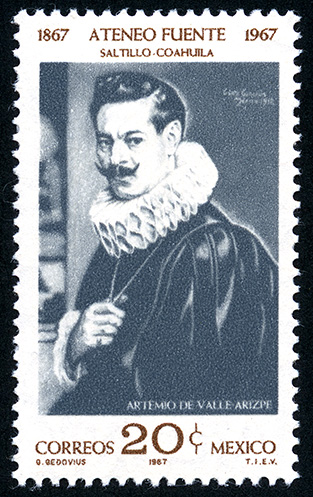 No. Scott: 986 -- Año de Emisión: 1967 -- Valor facial: Veinte Centavos -- Variedad de color: Gris Pizarra y Café -- Perforación: 14 -- Tipo de impresión: Grabado Timbre Postal Mexicano en colores gris pizarra y café, en la imagen se observa la efigie del escritor mexicano Artemio del Valle Arizpe, en la parte superior está escrito "1867 ATENEO FUENTE 1967", "SALTILLO COAHUILA" y en la parte inferior "CORREOS 20 CTS MEXICO". Para más información favor de dirigirse a biblioteca@mufi.org.mx