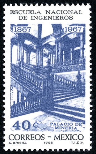 No. Scott: 989 -- Año de Emisión: 1968 -- Valor facial: Cuarenta Centavos -- Variedad de color: Azul Gris y Negro -- Perforación: 14 -- Tipo de impresión: Grabado Timbre Postal Mexicano en colores azul, gris y negro, en la imagen se observa el interior del edificio del Palacio de Minería en la Cd. de México, en la parte superior está escrito "ESCUELA NACIONAL DE INGENIEROS 1867-1967" y en la parte inferior el valor facial de "40 CTS" y "CORREOS MEXICO". Para más información favor de dirigirse a biblioteca@mufi.org.mx