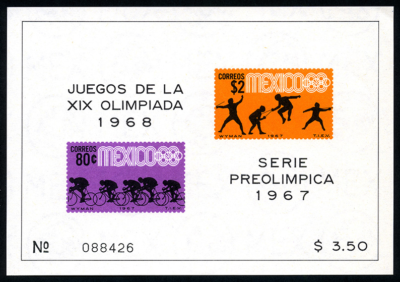 Hoja recuerdo representando varios deportes olímpicos -- Con marca de Agua: MEX MEX Y ÁGUILA EN CÍRCULO CERRADO ( XVI ) -- Huecograbado -- Sin Perforación -- Tres Pesos con Cincuenta Centavos -- Violeta, Amarillo, Naranja y Negro