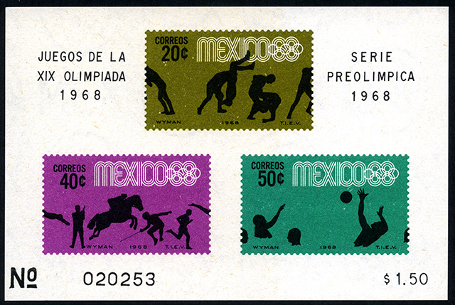 Hoja recuerdo representando varios deportes olímpicos -- Con marca de Agua: MEX MEX Y ÁGUILA EN CÍRCULO ( XVII ) -- Huecograbado -- Sin Perforación -- Un Peso con Cincuenta Centavos -- Verde Olivo, Violeta, Verde Negro