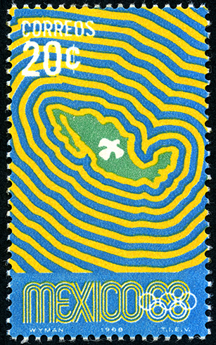 No. Scott: 996 -- Año de Emisión: 1968 -- Valor facial: Veinte Centavos -- Variedad de color: Azul, Amarillo y Verde -- Perforación: 14 -- Tipo de impresión: Grabado Timbre Postal Mexicano en colores azul, amarillo y verde, en el fondo de la imagen se observa el mapa de México en color verde y una paloma blanca, en la parte superior aparece escrito "CORREOS" y el valor facial de "20 CTS", en la parte inferior "MEXICO 68" Para más información favor de dirigirse a biblioteca@mufi.org.mx