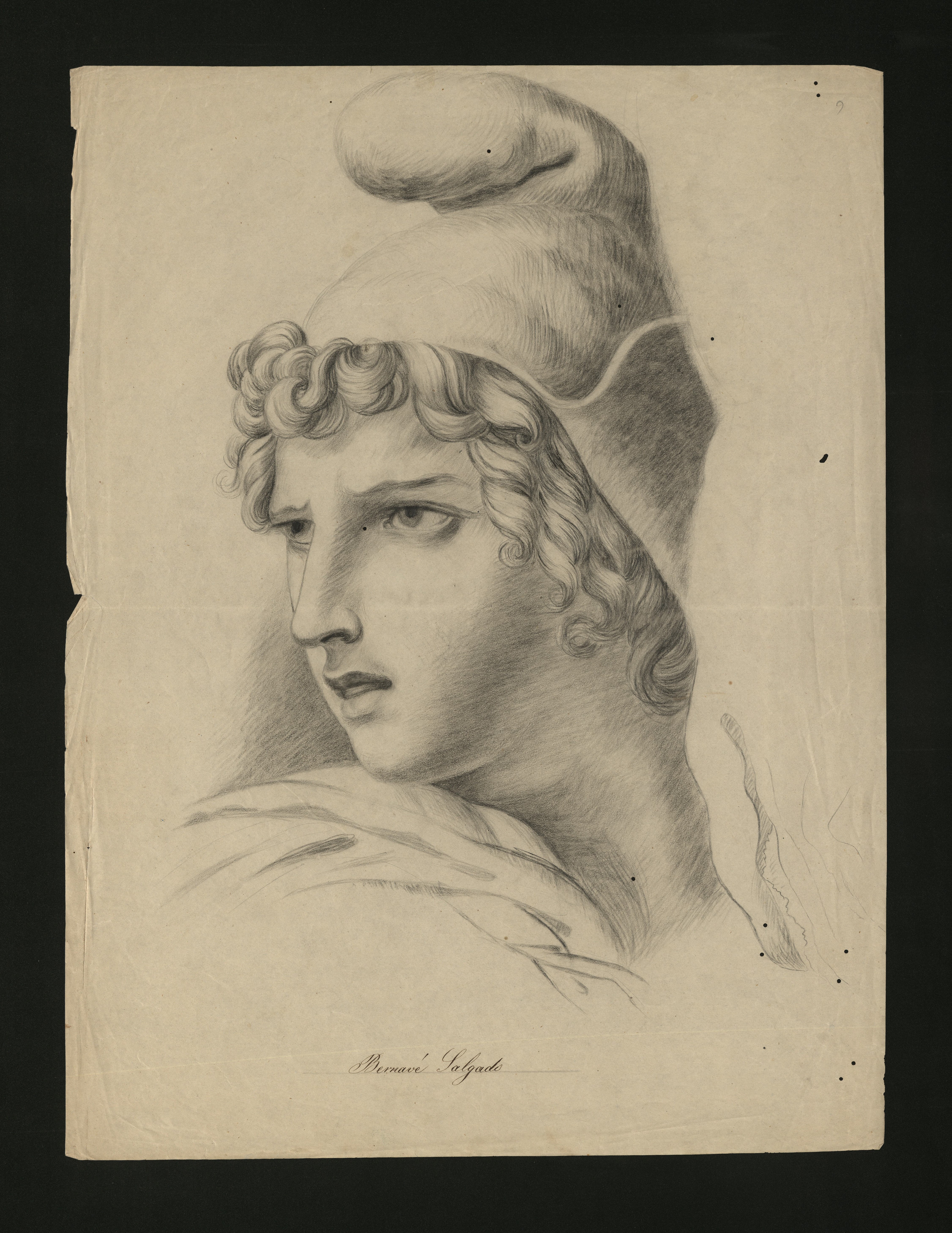 Dibujo de una figura masculina de edad joven en una postura de medio perfil, de cabello ondulado, cejas delgadas, nariz “griega” y labios pequeños, se encuentra girando hacia su derecha. Viste un gorro con dobles y lo que parece una túnica. En la parte inferior central se lee la inscripción “Bernavé Salgado”.