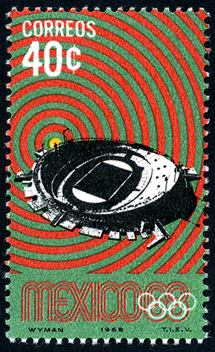 No. Scott: 997 -- Año de Emisión: 1968 -- Valor facial: Cuarenta Centavos -- Variedad de color: Rojo y Verde -- Perforación: 14 -- Tipo de impresión: Grabado Timbre Postal Mexicano en colores rojo y verde, en el centro de la imagen se observa a mi parecer un estadio de futbol en colores blanco y negro, en la parte superior aparece escrito "CORREOS" y el valor facial de "40 CTS" y en la parte inferior "MEXCICO 68". Para más información favor de dirigirse a biblioteca@mufi.org.mx