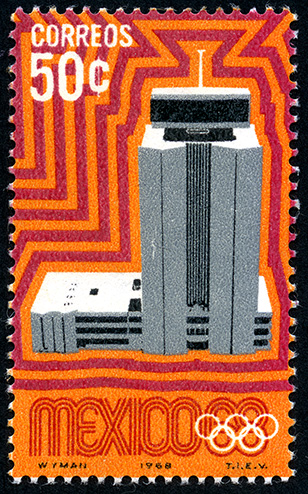 Torre de Microondas de la Secretaría de Comunicaciones -- Con marca de Agua: MEX Y ÁGUILA EN CÍRCULO ABIERTO ( XVII ) -- Huecograbado -- Con Perforación -- Cincuenta Centavos -- Naranja, Rojo, Gris, Verde