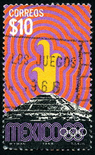 Símbolo del Fuego Olímpico sobre la Pirámide del Sol de Teotihuacán -- Con marca de Agua: MEX Y ÁGUILA EN CÍRCULO ABIERTO ( XVII ) -- Huecograbado -- Con Perforación -- Diez Pesos -- Negro, Violeta, Naranja, Amarillo