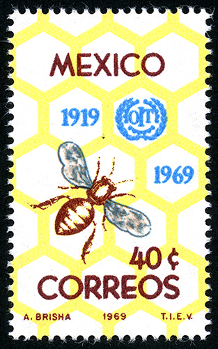 No. Scott: 1006 -- Año de Emisión: 1969 -- Valor facial: Cuarenta Centavos -- Variedad de color: Amarillo, Azul, Gris, Rojo Oscuro -- Perforación: 14 -- Tipo de impresión: Grabado Timbre Postal Mexicano en colores amarillo, azul, gris y rojo oscuro, en la imagen se observa un panal y una aveja, así como el emblema del "ILO", arriba aparece la palabra "MEXICO", abajo el valor facial de "40 C" y "CORREOS". Para más información favor de dirigirse a biblioteca@mufi.org.mx