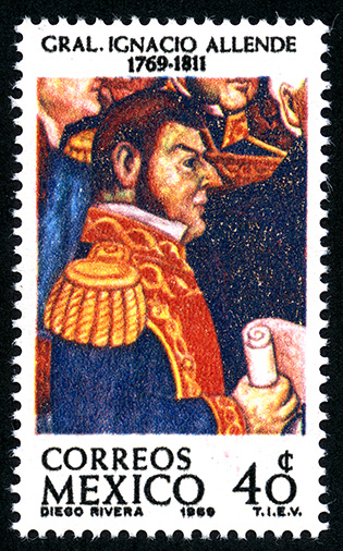 No. Scott: 1007 -- Año de Emisión: 1969 -- Valor facial: Cuarenta Centavos -- Variedad de color: Multicolor -- Perforación: 14 -- Tipo de impresión: Grabado Timbre Postal Mexicano multicolor, en la imagen se observa al General Ignacio Allende, en la parte inferior está escrito "CORREOS MEXICO" y el valor facial de "40 C". Para más información favor de dirigirse a biblioteca@mufi.org.mx