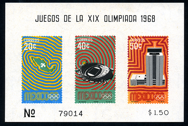 Hoja Recuerdo de la XIX Olimpiada 1968, en México -- Con marca de Agua: MEX Y ÁGUILA EN CÍRCULO CERRADO ( XVII ) -- Huecograbado -- Sin Perforación -- Un Peso con Cincuenta Centavos -- Amarillo,Verde, Azul, Rojo, Negro, Naranja