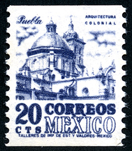 Catedral de la Ciudad de Puebla. -- Con marca de Agua: MEX-MEX Y ÁGUILA EN CÍRCULO ABIERTO EN POSICIÓN VERTICAL ( XVI ) -- Fotograbado -- Con Perforación -- Veinte Centavos -- Azul Oscuro